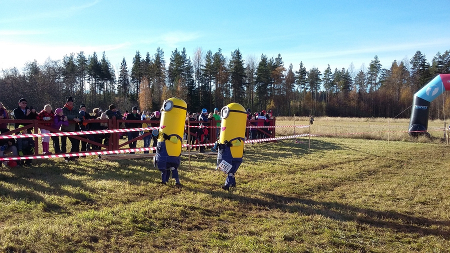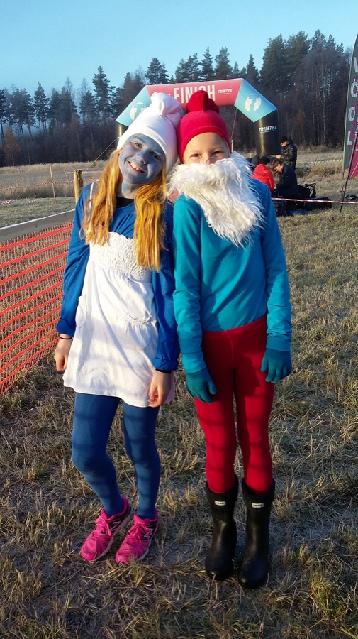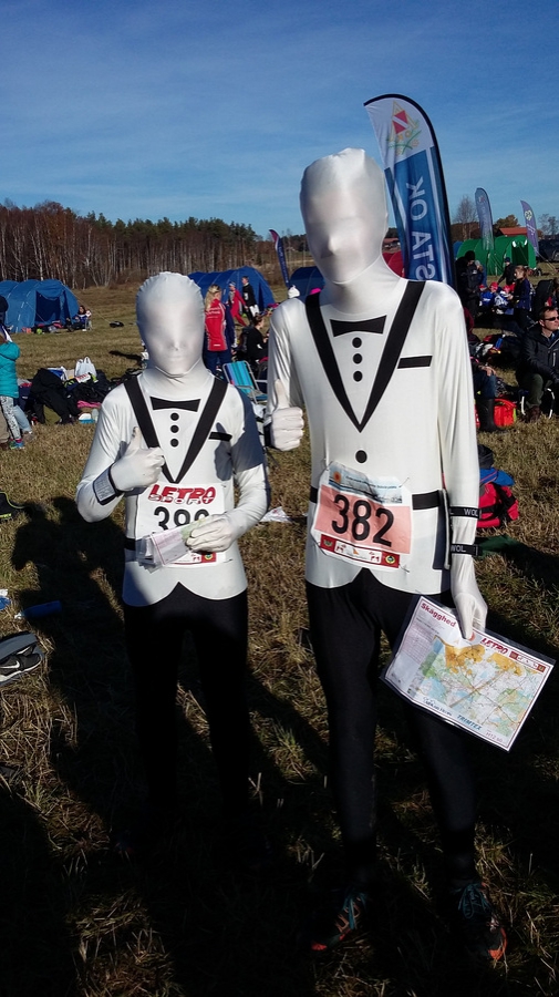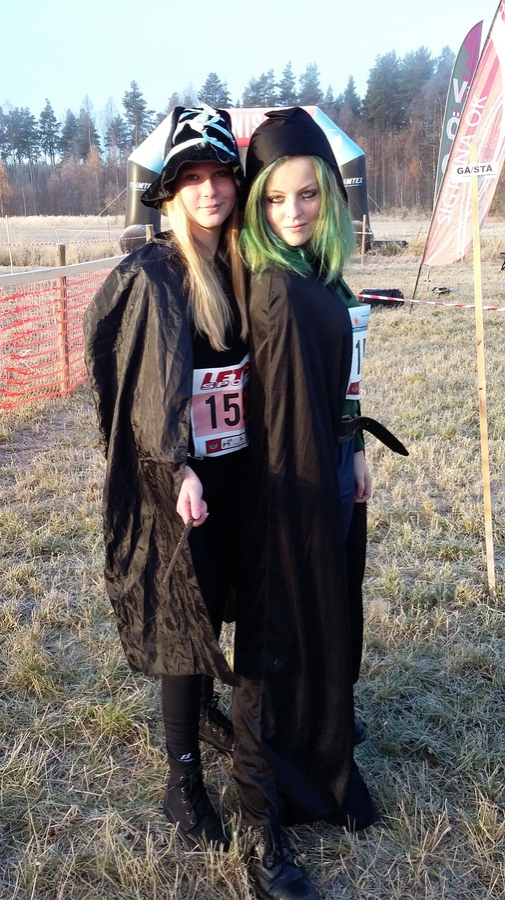 Det var kul att klä ut sig, men det kan vara svårt att springa i utklädningskläder. Dubbskor kan lätt fastna i klänningen som man har på sig… Tips är att inte ta en klänning med små hål i, för där kan dubbarna fastna. Då kan man trilla pladask minst tio gånger. Startade man tidigt så kanske kärren fortfarande varit frusna och det hade gått lättare att springa, men startade man senare så blev det mer stigar i skogen. Idag var det mycket längre bana än vanligt, på en D14 bana kunde man lätt springa nästan 10 km. I Dalarna verkar man tycka att grön skog = “mestadels god framkomlighet”.