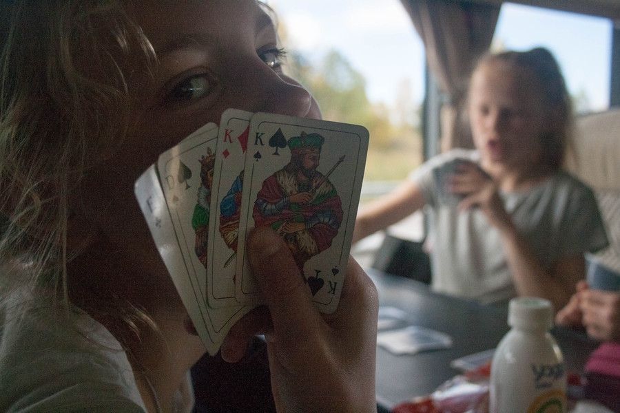 Mobiler är inte heller bra, det blir lätt asocialt då, och man glömmer bort var man har laddaren. Det är bättre med en kortlek, då kan man ha kul tillsammans. Om spader kung är borta ur kortleken, så är det bra att leta på golvet eller under alla väskor, det kan vara där han gömmer sig. Men det kanske man kan förstå när vi tjejer slänger honom på bordet och slår på honom, då förstår även vi att han gick och gömde sig.