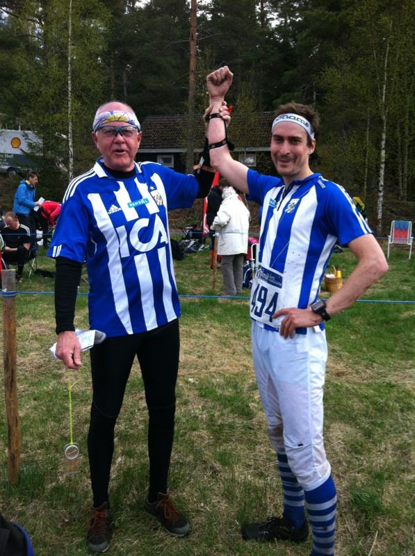 Silvermannen Hans Karlsson höjer helgens konung Fredrik Perssons (den något smalare på bilden) arm vid söndagen Ändå Något.