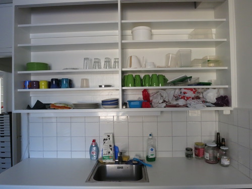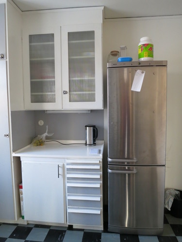Sist på rundvandringen kommer vi till källan till flest och störst konflikter i de flesta kollektiv, köket. Här är det avskalat och prydligt.Fördelen med våra nordiska grannländers matkultur är ju smörrebröden och skivorna, något som både sparar disk och minskar på matoset. Komplettera kostcirkeln med ett storpack proteinpulver, och även en diskmaskin, och du får ett näst intill grälfritt hem.