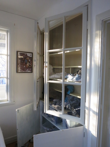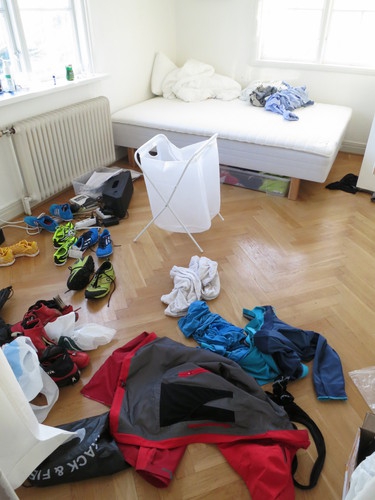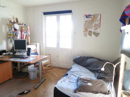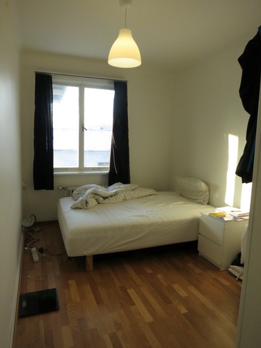 Nästa rum tillhör Eskil, kollektivetes slarver, som vid fototillfället hade åkt på samling, och tagit med sig de mesta av garderobens innehåll från golvet, för nu kunde man skönja parketten. Mycket talar ju ändå för att detta är ett vinnande koncept. Här går lyckligtvis att vädra från två håll, så det ska inte vara någon risk för rumsgrannarnas hälsa.
