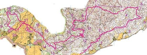 Min taktikk med å åpne offensivt hardt så ut til å treffe bra: löypa var relativ enkel frem til förste melde. Kneet gjorde heller ikke alt for vondt så det var bare å guffe på. I bakkene opp fra 6.post gikk det tyngre og jeg fikk også den förste usikkerheten. På vei ut av posten visst leste jeg meg inn fort men noe av mistet noe av flyten og tok en litt annen trasé enn planlagt. Usikkerhet og tvil er blant det verste på mellomdistanse. Man taper mye mer tid enn man tror, og på mellomdistanse er det sjeldent veivalgene som skiller. For å ta igjen dette forsöker jeg å öke tempoet i bakken opp mot sjuende post men merker at beina ikke spiller helt på lag. Har jeg åpnet for hardt? Dette er tanker man bör unnvike i et löp men det er ikke alltid enkel å ikke la seg påvirke. Etter en bedre periode leser jeg feil skrent på vei mot den tolvte posten og löper for höyt inn mot posten. Bruker litt tid på å lese meg inn, og på vei tilbake mot posten er det flere nedfallsträr og store steiner jeg må löpe igjennom. Bommer tar tid i dette steinete terrenget. Ut av tolvte post blir jeg litt på etterskudd med kartlesingen og tar meg ikke tid til å sjekke kompass og kart nøyaktig nok. Den stenete bunnen gjör det krevende å lese kartet i fart, og jeg burde stoppet og lest meg inn. I stedet for å ligge langs streken eller svakt venstre de förste 2-300 meterne dreier jeg for lang höyre og krysser et område med mange steiner, skrenter og kalkhull. Igjen taper man mer enn man kanskje tror og i et slikt terreng.