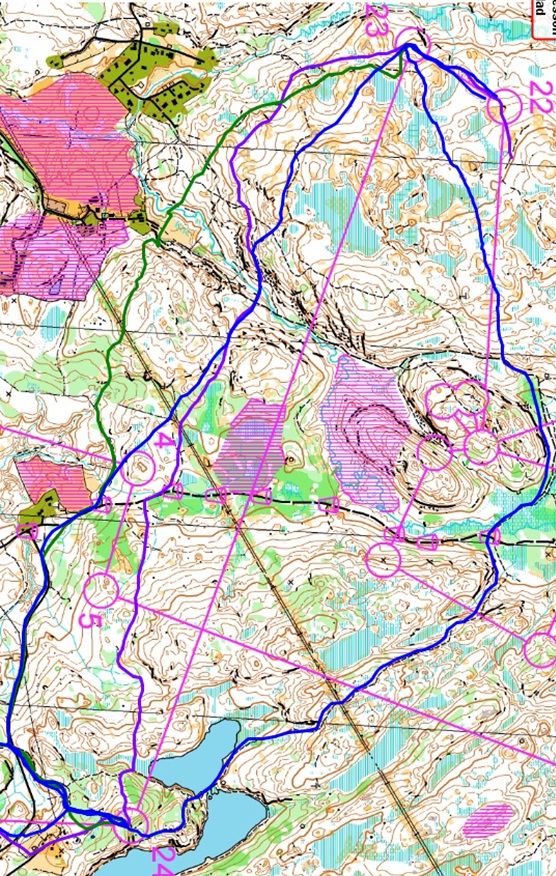 Tuff terräng, men vackert och underbar orientering. Här bjöds vi på en klassisk banläggarfälla. Superkort sträcka till ettan och sedan superlång sträcka till tvåan. Jag föll pladask i fällan. Jag stod säkert 30 sekunder vid kontrollen innan jag bestämde mig för? Inget! Nja, kanske något högeralternativ, men jag ändrade mig 1 min senare och försökte mig på ett vägval rakt på. Här får vi nu skåda ett skolexempel hur mycket tid man tappar om man inte är beslutsam i sin orientering. 4 minuters tapp, jösses! Man kan inte heller skylla på trötthet så tidigt på loppet.