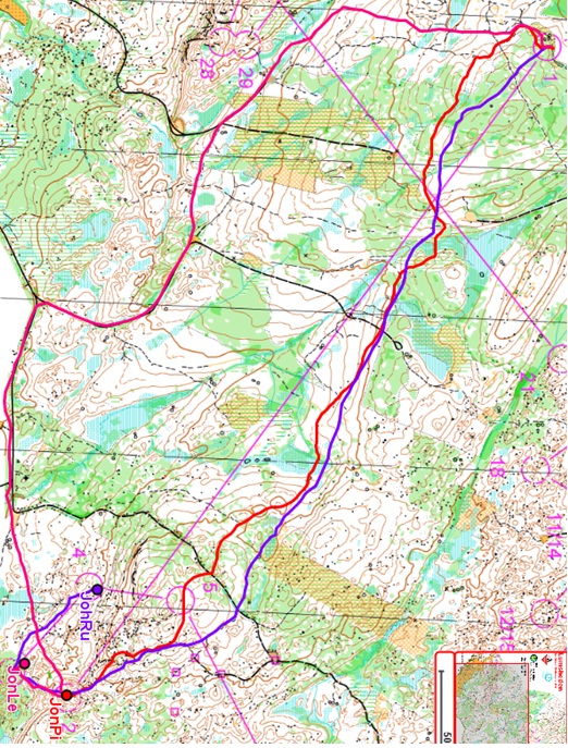 Tre olika vägval på i stort sett samma tid. Alla löparna genomför vägvalen i stort sett perfekt och litar på att det är det bästa, där har vi nyckeln.