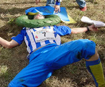 Liggandes på marken vrider jag mig i gräset för att undgå smärtan i benen. Märker till slut att någon har lagt en krans runt halsen på mig och inser att jag faktiskt lyckades. Vi tog GULD!