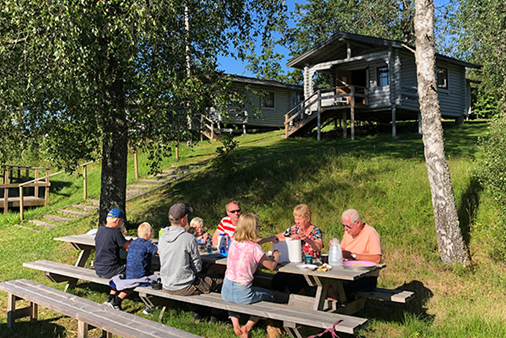 Stugbyn består av 18 knuttimrade stugor, enkel standard, med våningssängar, kokplatta, kaffebryggare, mikrovågsugn, vattenkokare, kyl med frysfack och möblerad altan. I stugorna finns även täcken, kuddar, porslin, bestick, kastrull och stekpanna. I anslutning finns servicehus med toalett, dusch och diskrum. Servicehuset har kodlås. Koden erhåller vi tillsammans med stugnyckeln vid ankomst. Du behöver ta med sänglinne till stugan, eller hyra detta 80 kr/bädd.