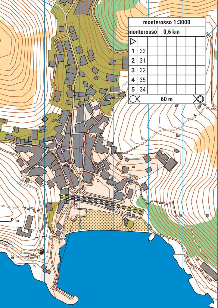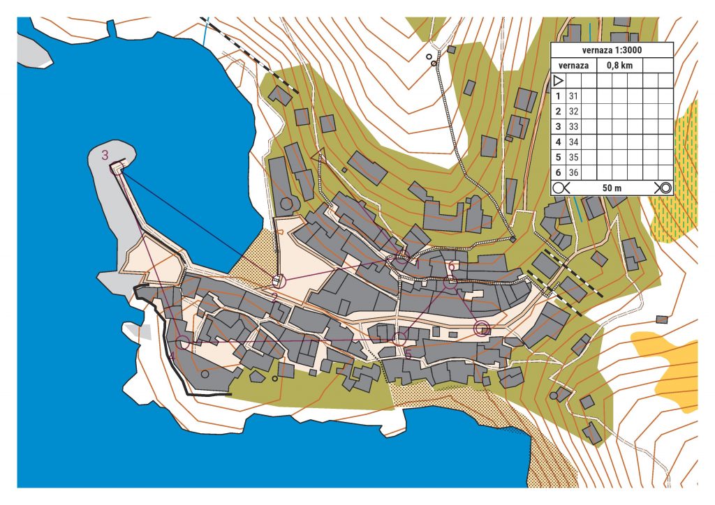 De funkade bra, utom i en by kanske där pappa glömt lägga med höjdkurvorna när kartorna skrevs ut. Det var såklart den brantaste byn. Där var vägar och gränder lite oprecisa så vi fick tänka lite för att få ihop det bra. Annars funkade kartorna förvånansvärt bra. Det blir inte lika detaljerat som en riktig sprintkarta med häckar, exakta detaljer och så men i de här byarna funkade det väldigt bra där det mest är hus, trappor, hårda ytor mellan husen som torg mm och hav. Även här var kartorna gjorda med information från openstreetmap som vi laddat ner och sen konverterat till orienteringskarta i OCAD.