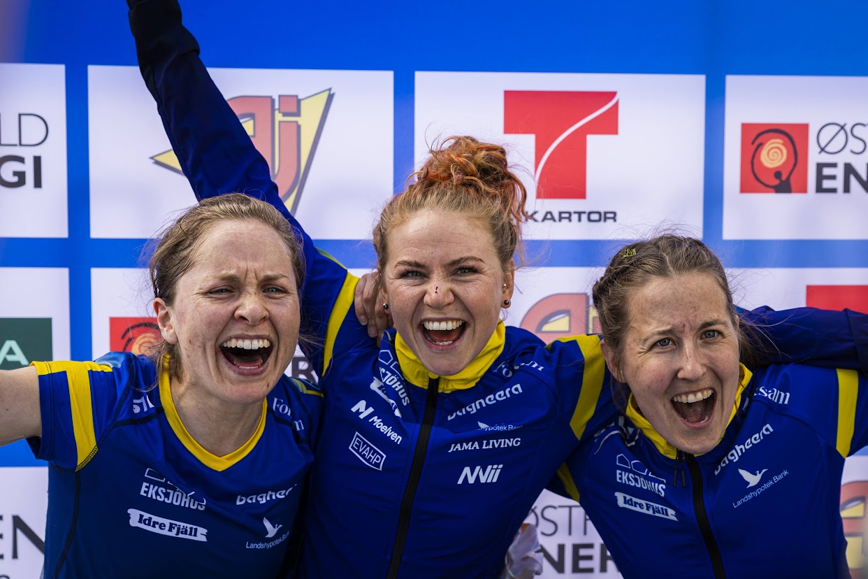 I damernas stafett var det klungor och inför tredje sträckan var det tre lag som var inom 7 sekunder. Elin Månsson sprang så väldigt fint på andra ihop som Ingrid Lundanes i Norge 2 och Norge 1, Schweiz 1 och Estonia. Vad hände med Tova i Sverige 1? Det visade sig att en bom och trötthet gjorde att hon tappade nästan 3 minuter. Sara som sprang tredje i lag1 kunde inte ta fatt när täten på sista sträckan sprang bra. I mot mål var det Sverige 2 med Lisa Risby, Schweiz eller Norge 1. Lisa gjorde ett bra vägval inför upploppet och tog en fin seger till Sverige, grattis tjejer! Norge 2 femma, Sverige 1 åtta, Danmark 1 nia och Frankrike tolfte plats.
