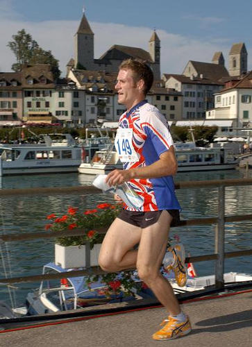 Jamie tar ett platt längre runtvägval runt slottet i centrala Rappersvil i Schweiz och det vinner han på. Efter sju minuters löpning är Jamie i ledningen i loppet. 2.8 km tar 12.43. Jamie har satsat extra hårt på just sprinten på VM och det har gett resultat.